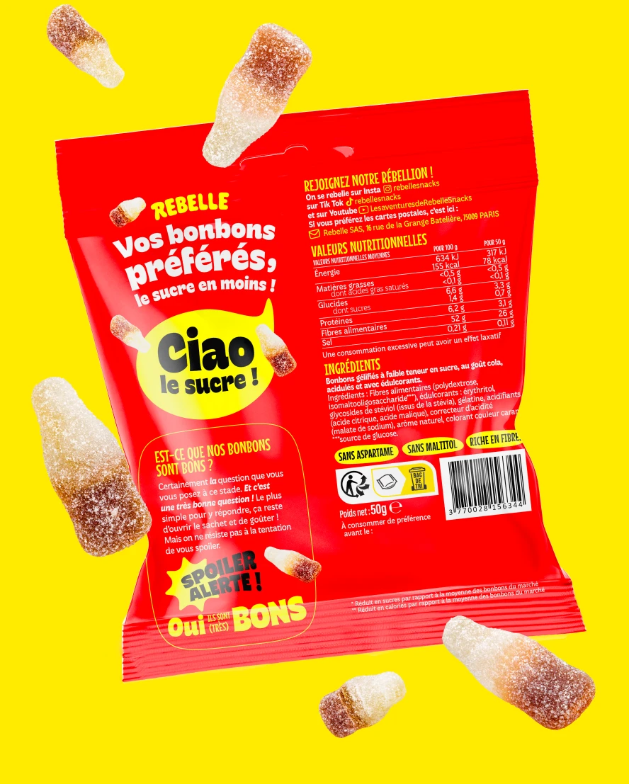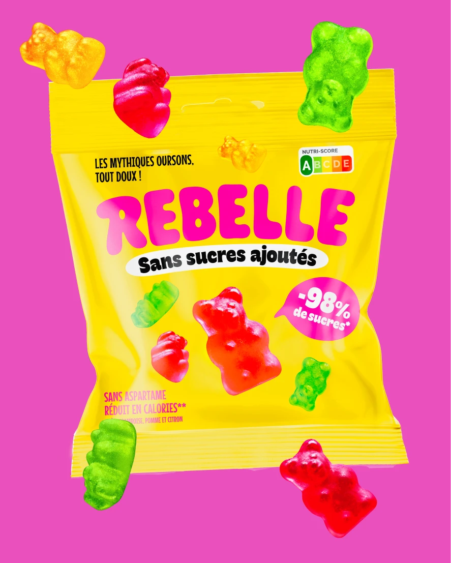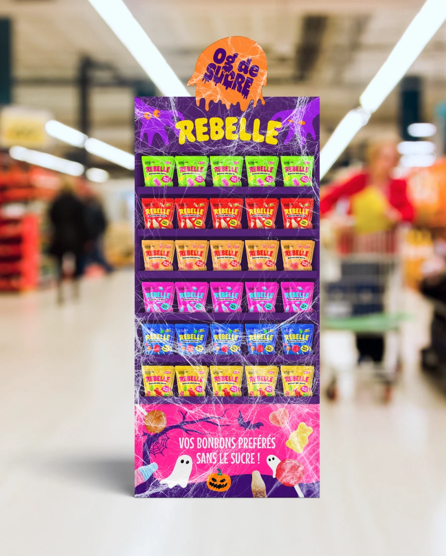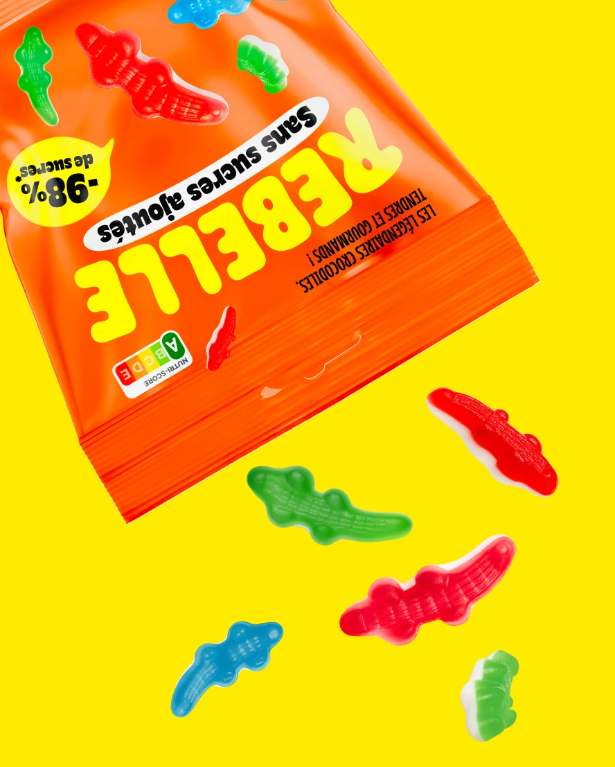 Pour faire honneur à la marque et à son nom, nous avons mis les bouchées doubles ! Couleurs pops, avalanches de bonbons, promesse ultra claire et impactante. On ne peut pas les louper dans le supermarché !