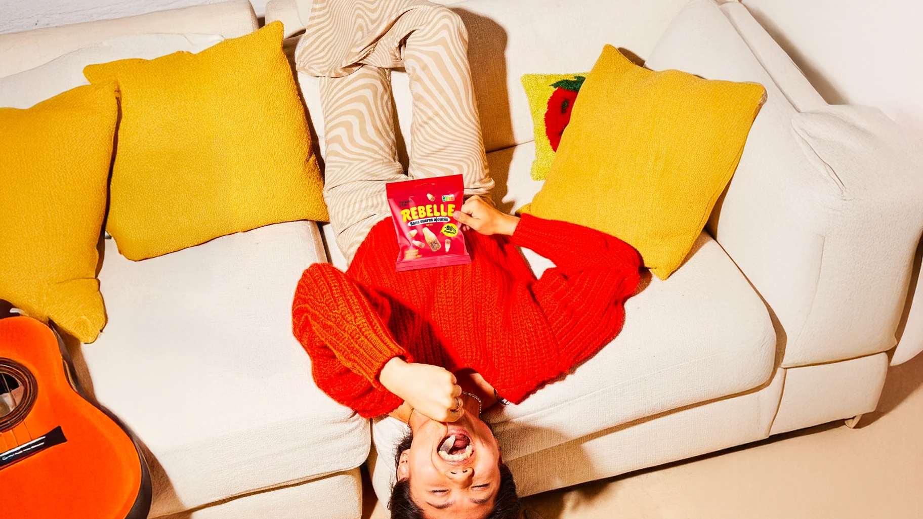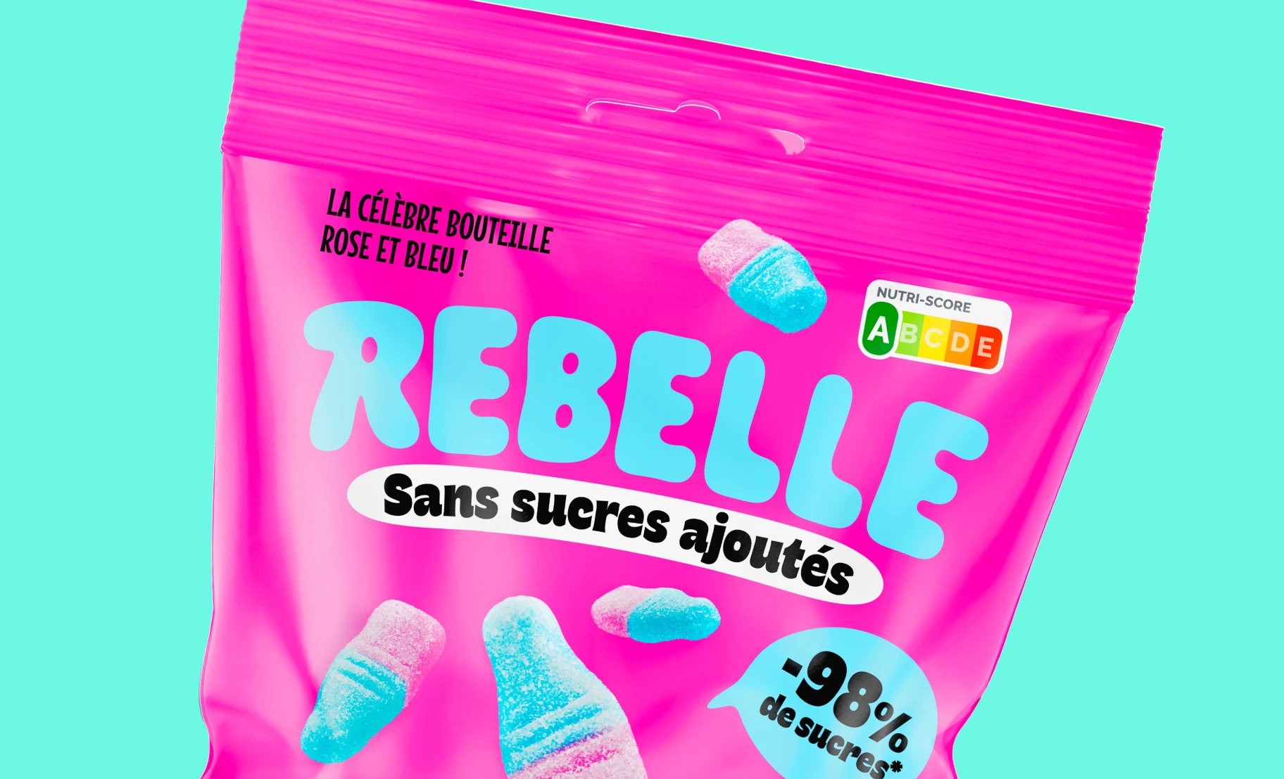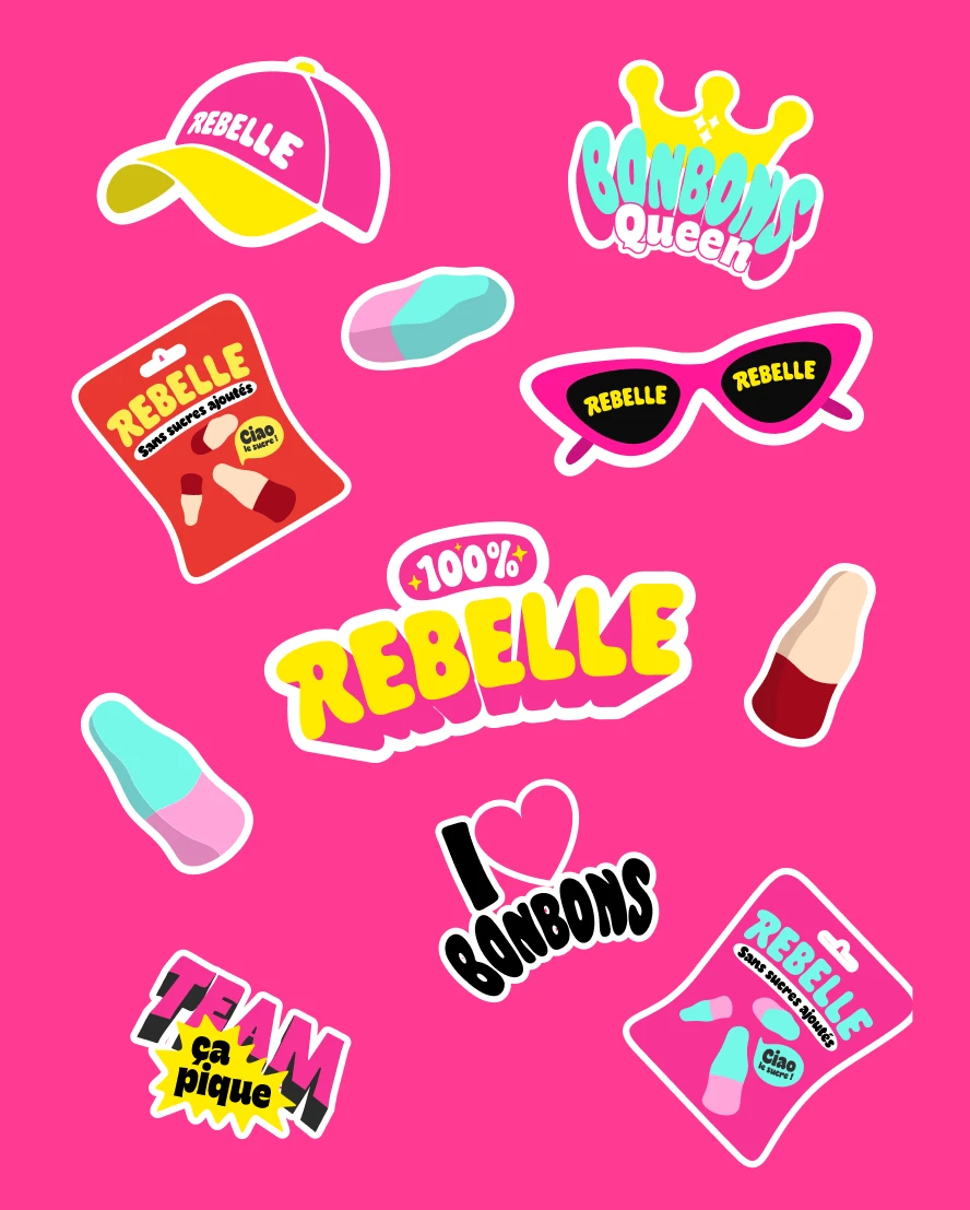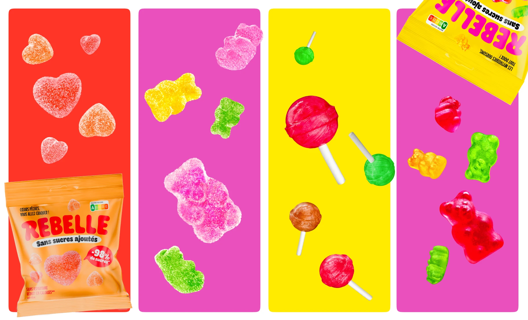 Pour faire honneur à la marque et à son nom, nous avons mis les bouchées doubles ! Couleurs pops, avalanches de bonbons, promesse ultra claire et impactante. On ne peut pas les louper dans le supermarché !
